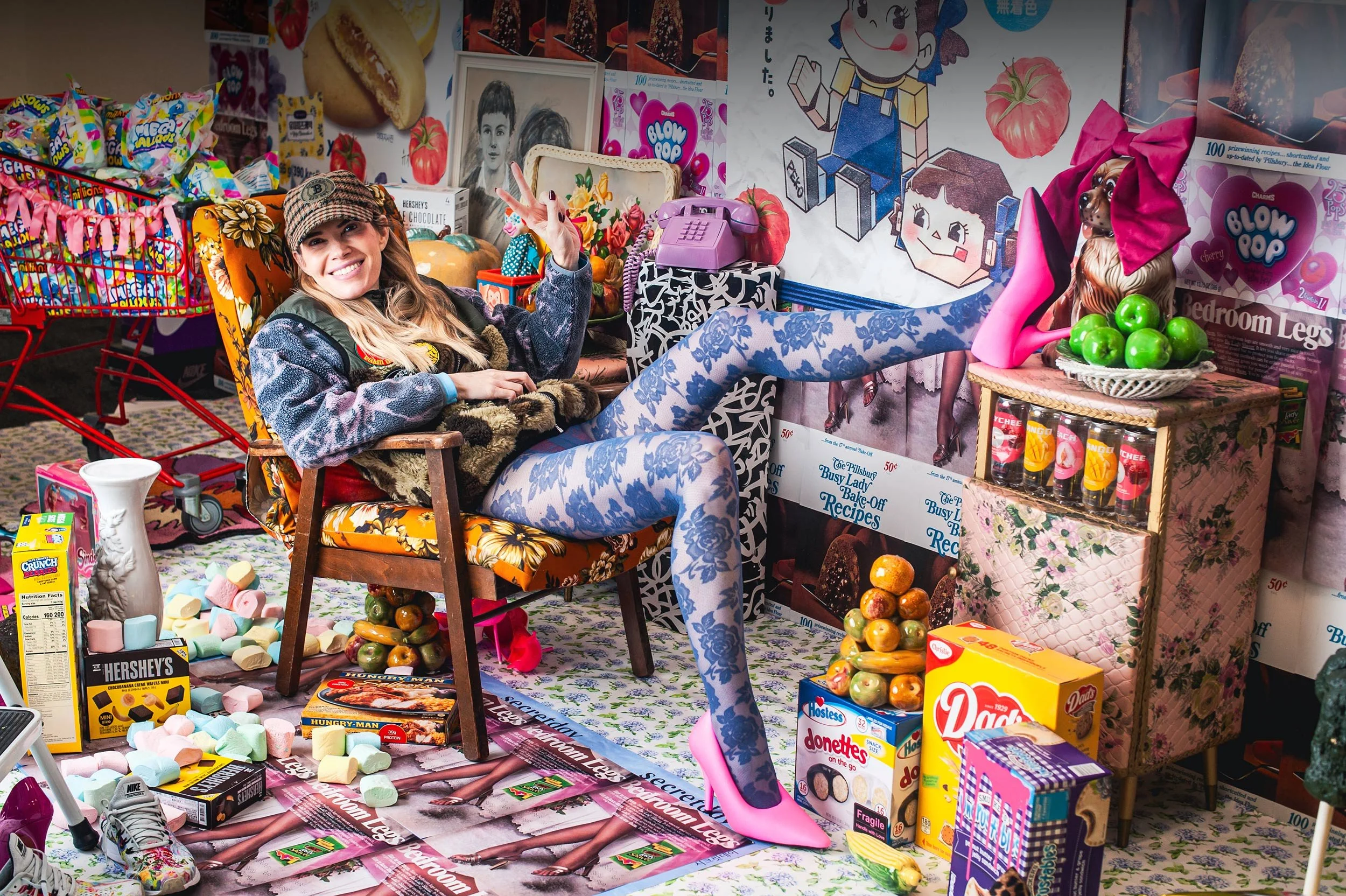 Drawing from consumer materials, vintage objects, and familiar visual languages, her work transforms spaces into environments of curiosity and delight, where humour and imagination open pathways.